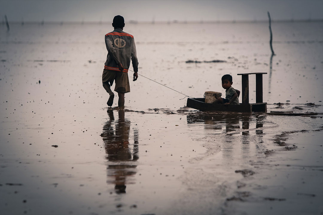 There they hunt for crabs, shrimp, and mudskippers. If they catch enough fish to eat and some left over to sell, the money buys rice. When they don’t get enough, she adds sugar to hot water to make a soup for the children. Ten years ago, she says, there were more fish. Now the fish have disappeared. She thinks that it’s the clearing of all the mangroves and dredging of canals that caused this.